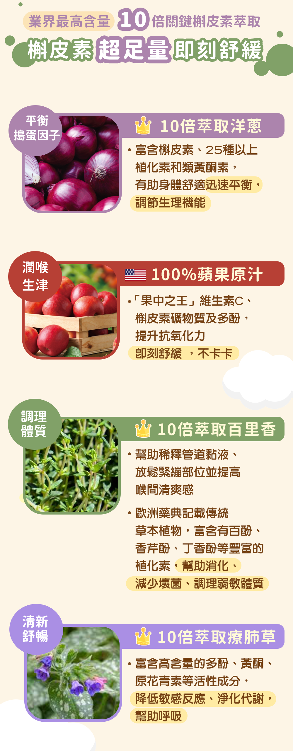 10倍洋蔥萃取物 + 100%美國蘋果原汁,有感舒緩不適狀況