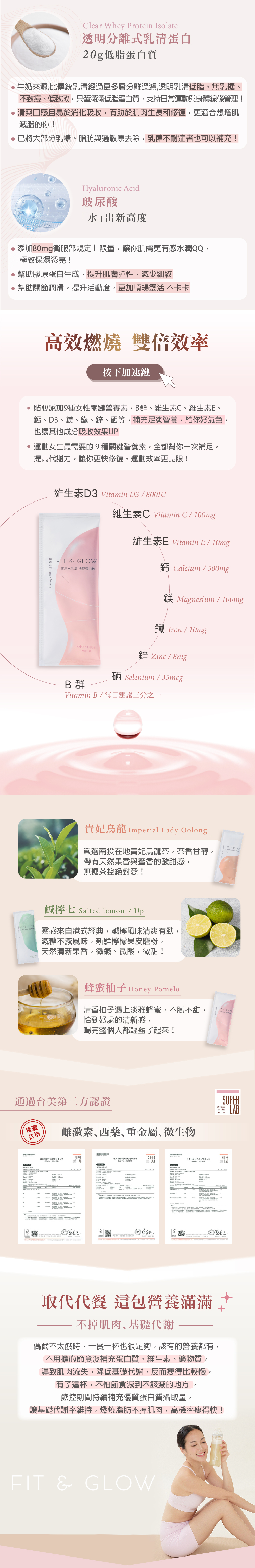 · 透明分離式乳清,只留精純蛋白質,低脂低熱量,不致痘,吸收率超過90%,最適合增肌減脂!