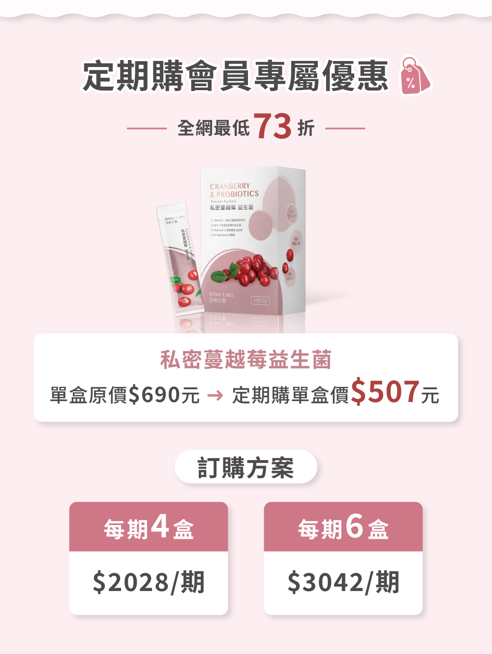 私密蔓越莓益生菌:單盒原價$690元➜定期購單盒價$507元